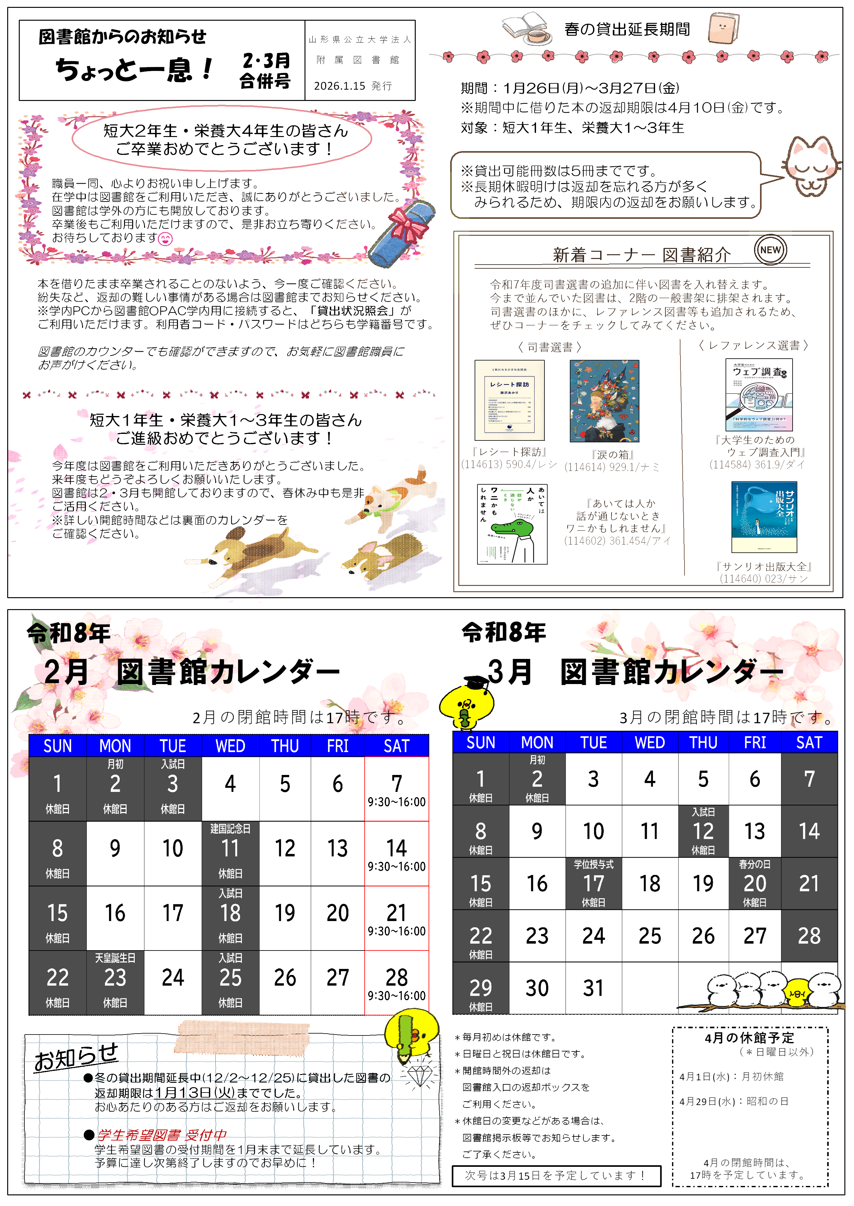 開館⽇をお知らせする図書館カレンダー等、当館に関する様々な情報を掲載しております。